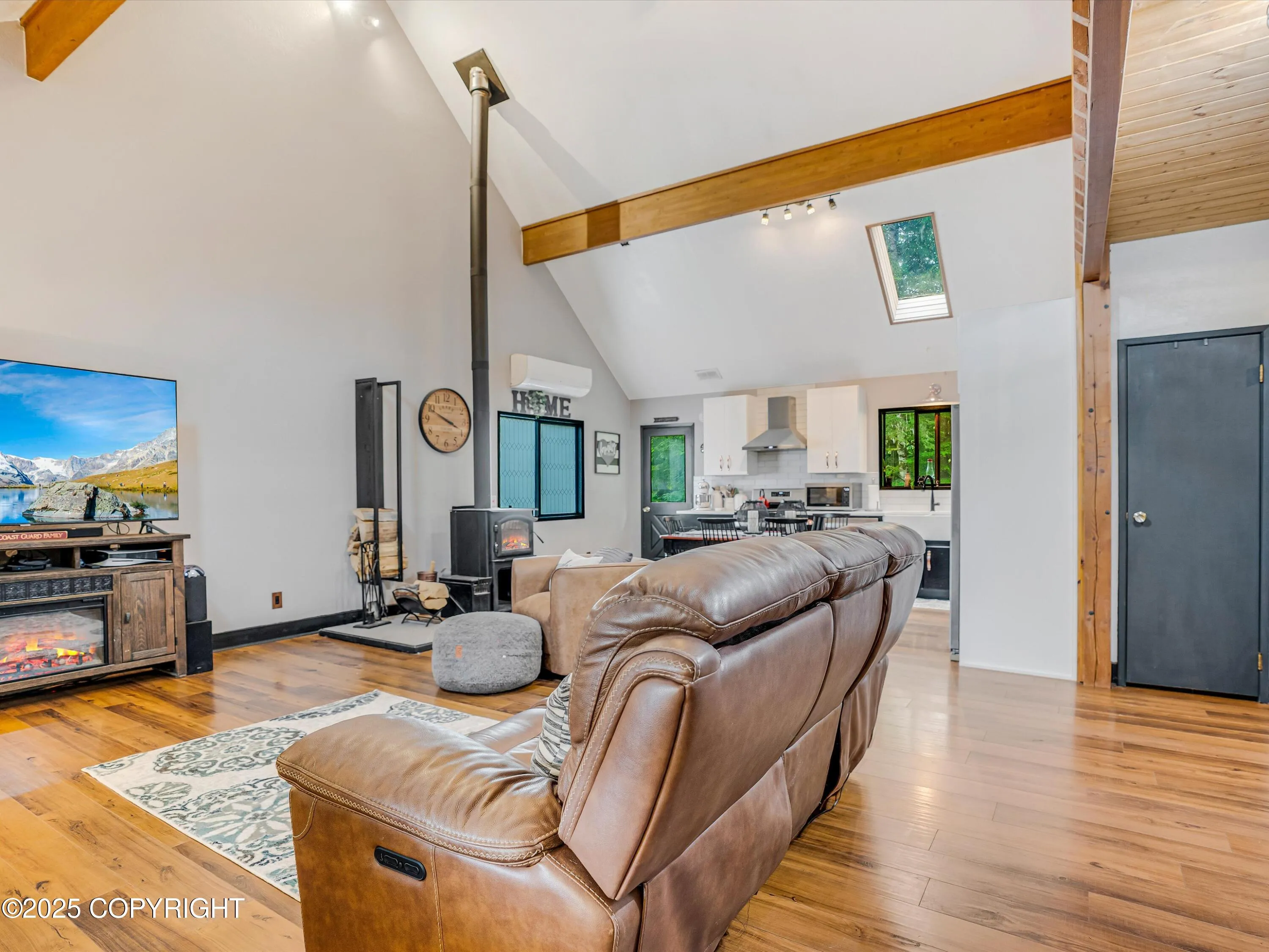 Inside, you'll find cathedral ceilings, a cozy wood stove, and an efficient electric heat heat pump providing both heating and air conditioning. The modern kitchen features quartz countertops, a tile backsplash, gas range, and stainless steel appliances. Recent updates add to the home's appeal.\n